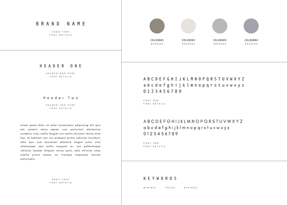 - A style guide PDF with colour palette, fonts guidelines and brand keywords that reflect your brand style.