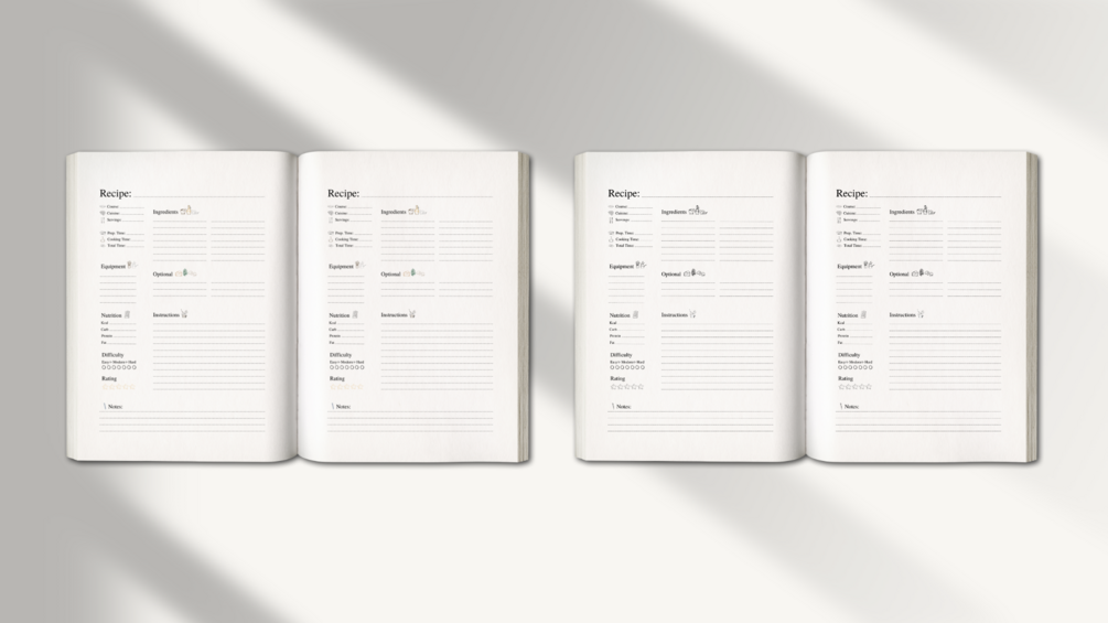 Ready to use 200-page recipe book interior pdf documents for personal use and Amazon KDP book publishers.